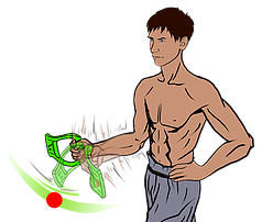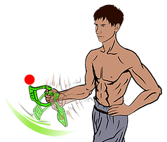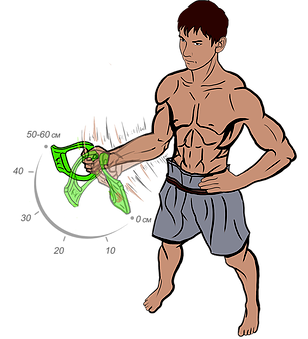 1. Зажми рукоятку тренажера Evnik кистью руки. Ноги поставь на ширине плеч. 2. Согни руку в локте, так как это показано на рисунке. 3. Начни водить тренажером из стороны в сторону. 4. Обрати внимание, что увесистая часть (далее У.Ч.)Evnik или просто лопасть, должна двигаться в диапазоне 50-60 см. ВАЖНО: Начни производить плавное движение с целью ускорения У.Ч. Evnik. ВАЖНО: Ускоряем не руку, а У.Ч. Evnik! Evnik начинает прогибаться и в этот момент ты чувствуешь сам принцип нагрузки. ВНИМАНИЕ: кисть должна оставаться неподвижной, движение осуществляется в плечевом суставе. |